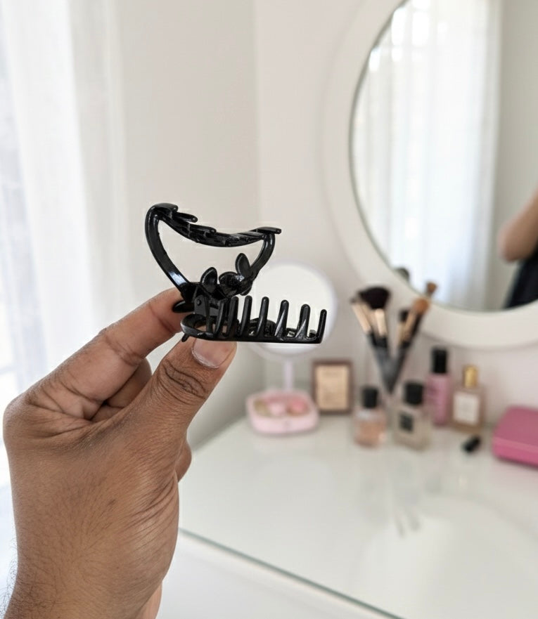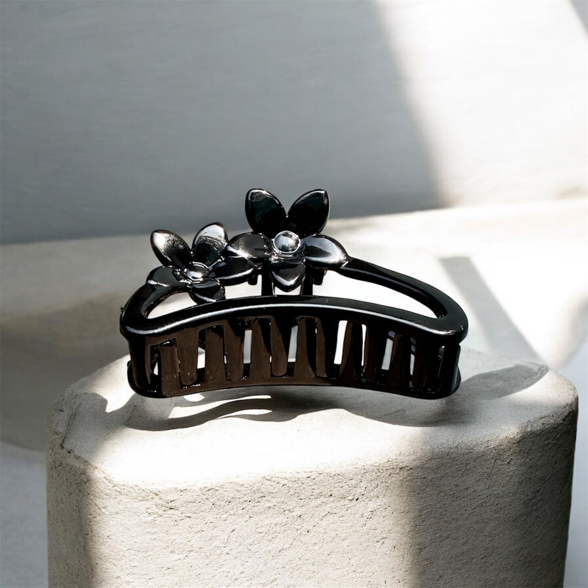 This floral hair claw clip features a glossy black finish with a delicate flower design that adds a subtle touch of elegance to everyday hairstyles. Designed with a strong spring mechanism and smooth rounded teeth, it provides a secure grip without pulling or damaging hair.
